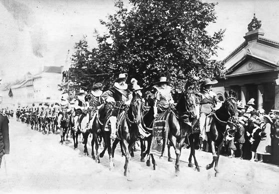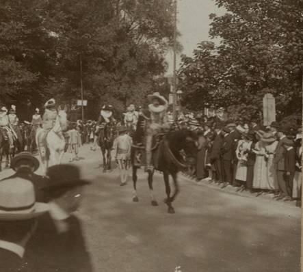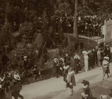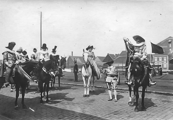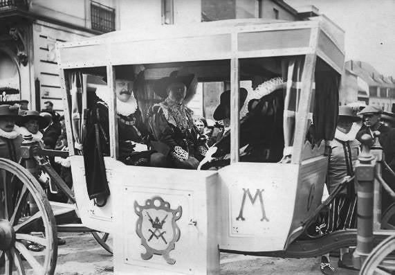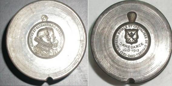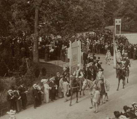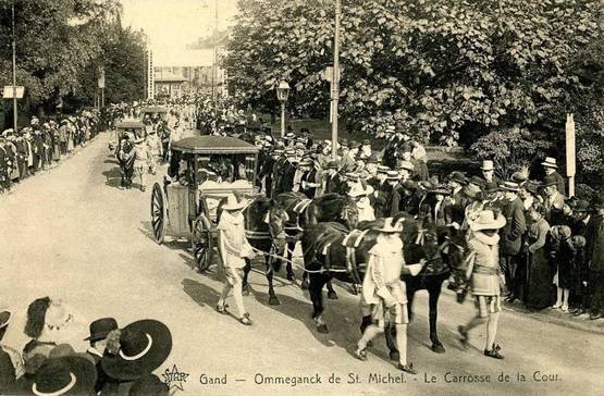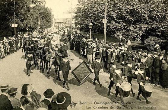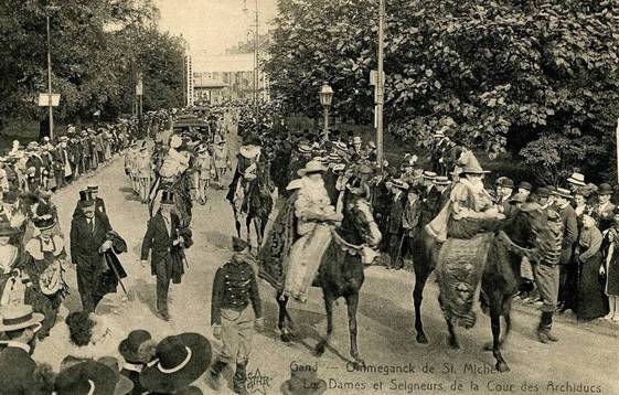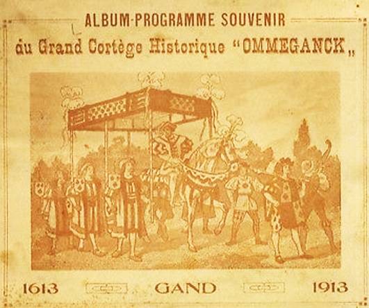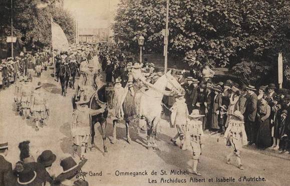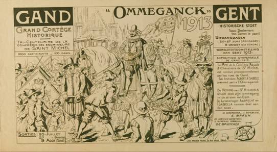 De Wereldtentoonstelling viel toevallig samen met het 300-jarige jubileum van de Schermersgilde van Sint-Michiels die besliste de verjaardag luisterrijk te vieren met een enscenering van de historische stoet van 1619. Dat jaar verbleven de Aartshertogen Albrecht en Isabella in Gent en zij hadden een bijzondere band met de Sint-Michielsgilde. De ommegang van 1913 was een opeenvolging van zes verschillende groepen: de gilden, de schermers van Sint-Michiels, vertegenwoordigers van de stad, de aartshertogen, de drie Gentse schuttersgilden en de rederijkerskamers. De stoet reed drie keer uit op 20, 27 juli en 9 augustus. Telkens werd een ander parcours aangedaan zodat zoveel mogelijk Gentenaars de stoet konden bewonderen. De laatste ommegang kon rekenen op Koninklijk bezoek dat die dag ook het monument voor de Gebroeders Van Eyck inhuldigde.